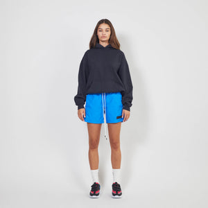 This hoodie has a relaxed fit, featuring an adjustable bungee at the waist and our signature center seam detail. It has somewhat of a boxy fit, with dropped shoulders and length that is meant to hit right at your belt line.
